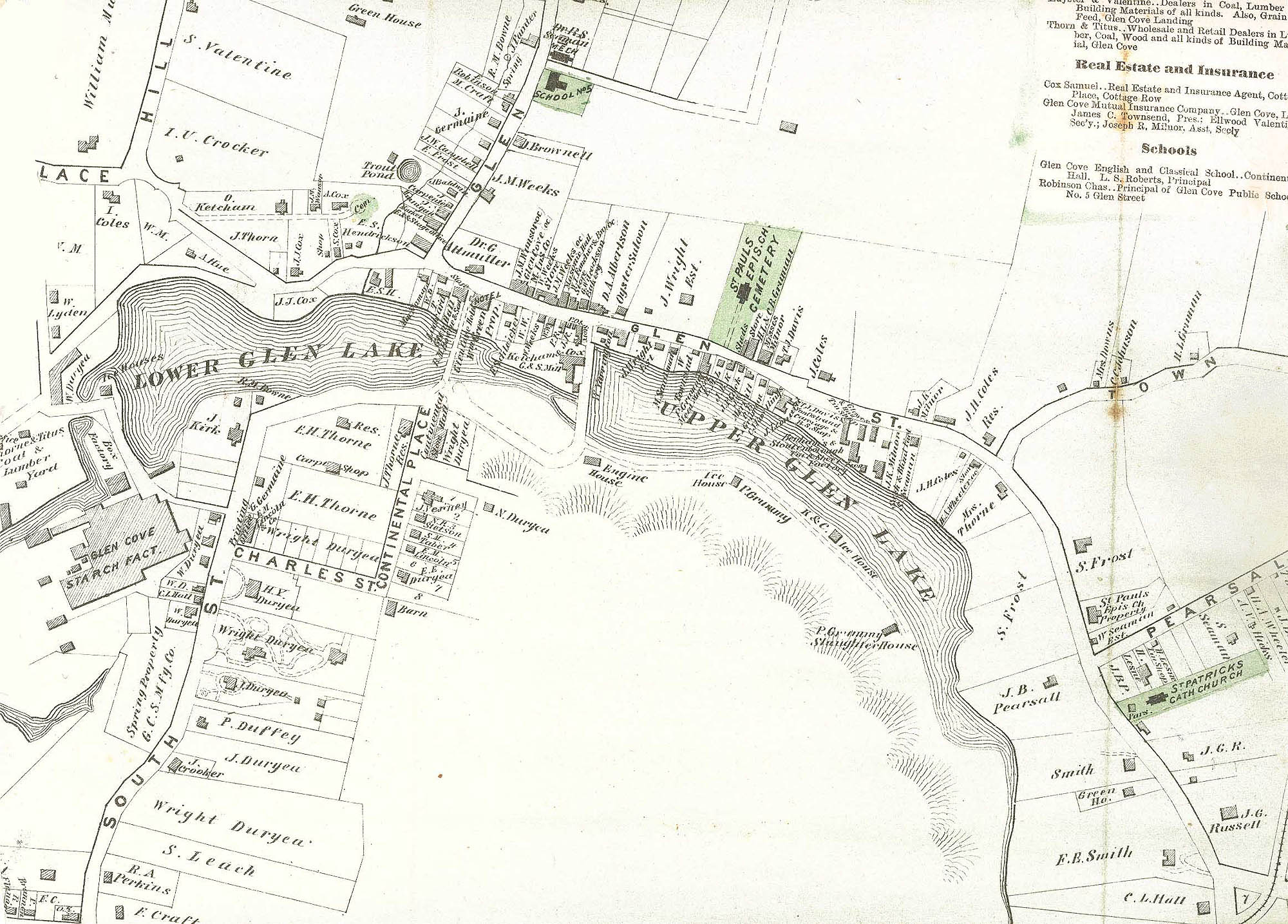 South of the Mill Ponds was an area called "South Glen Cove". Because the stream and mill ponds created a bit of a barrier to people travelling by horse and wagon (there were only two roads across the ponds, atop the mill dams) South Glen Cove didn't evolve as quickly as other parts of the community. It was home to the Duryea Starch Works as well as the homes of the Starch Works owners, and the estates of Wright Duryea and John Duryea are clearly seen just to the right of the Starch Works.